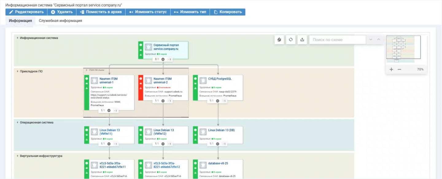 При этом возможности системы гибко настраиваются под особенности инфраструктуры. Например, можно учитывать не только само оборудование, но и зависимости между сервисами.