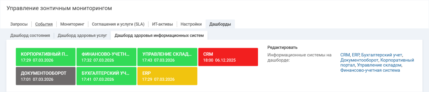На дашбордах визуально отображается статус критичных систем и сервисов с понятными индикаторами. Зеленый цвет — нормальная работа, желтый и серый — возможная недоступность, красный — критическое состояние. Это помогает команде ИТ быстро увидеть проблемные участки и приоритетно реагировать на сбои.