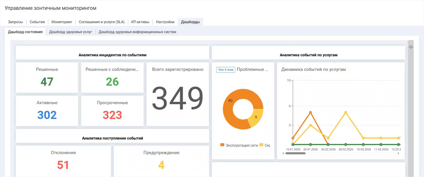 Дашборд показывает базовую аналитику по событиям зонтичного мониторинга. Например, сколько инцидентов мониторинга зарегистрировано за период, по каким услугам чаще регистрируются критичные события по обеспечивающей их инфраструктуре