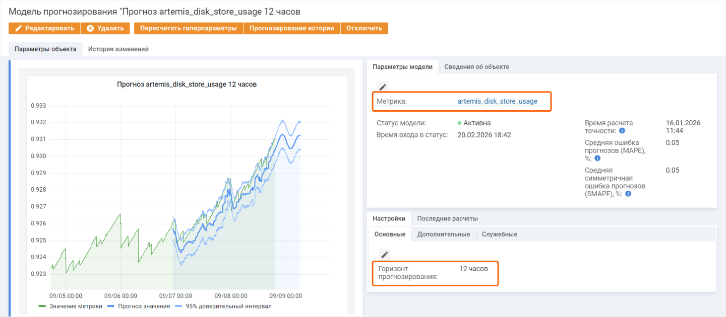 ML-модель с автоматически подобранными параметрами строит прогноз на выбранный горизонт и регулярно обновляет предсказание. Если ожидаемое значение метрики приближается к критическому порогу, триггер создает событие еще до фактического сбоя.