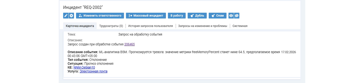Naumen BSM фиксирует будущее отклонение как инцидент или запрос на обслуживание. Далее создает заявку до наступления отказа оборудования
