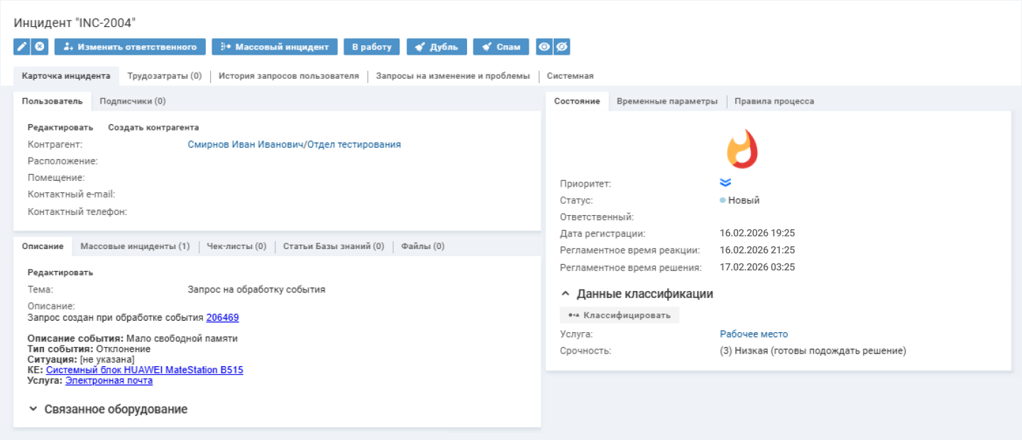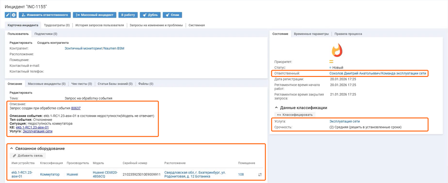 Если в течение этого интервала оборудование не восстановилось, система зарегистрирует новый инцидент по новому событию и сгруппирует с ним последующие. При закрытии инцидента автоматически закроются и все связанные события.