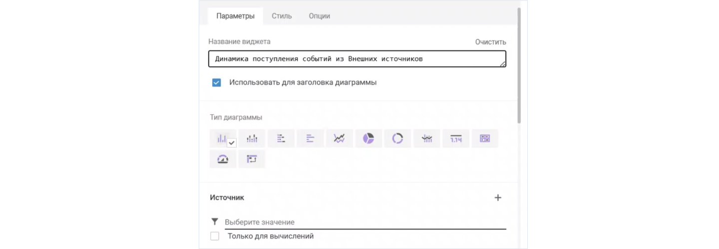 Если нужно отобразить динамику поступления событий из внешних систем, пользователь открывает дашборд, включает режим редактирования и добавляет новый виджет