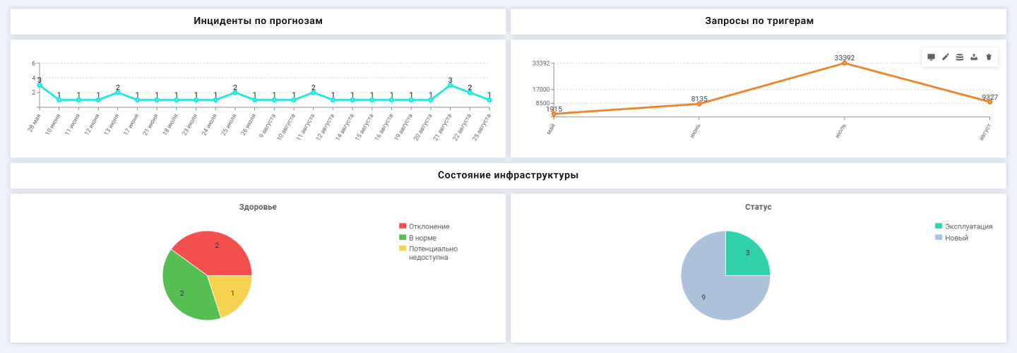 На дашборд выводится количество запросов в месяц, созданных при активации триггера, статистика инцидентов, количество оборудования с разным состоянием здоровья