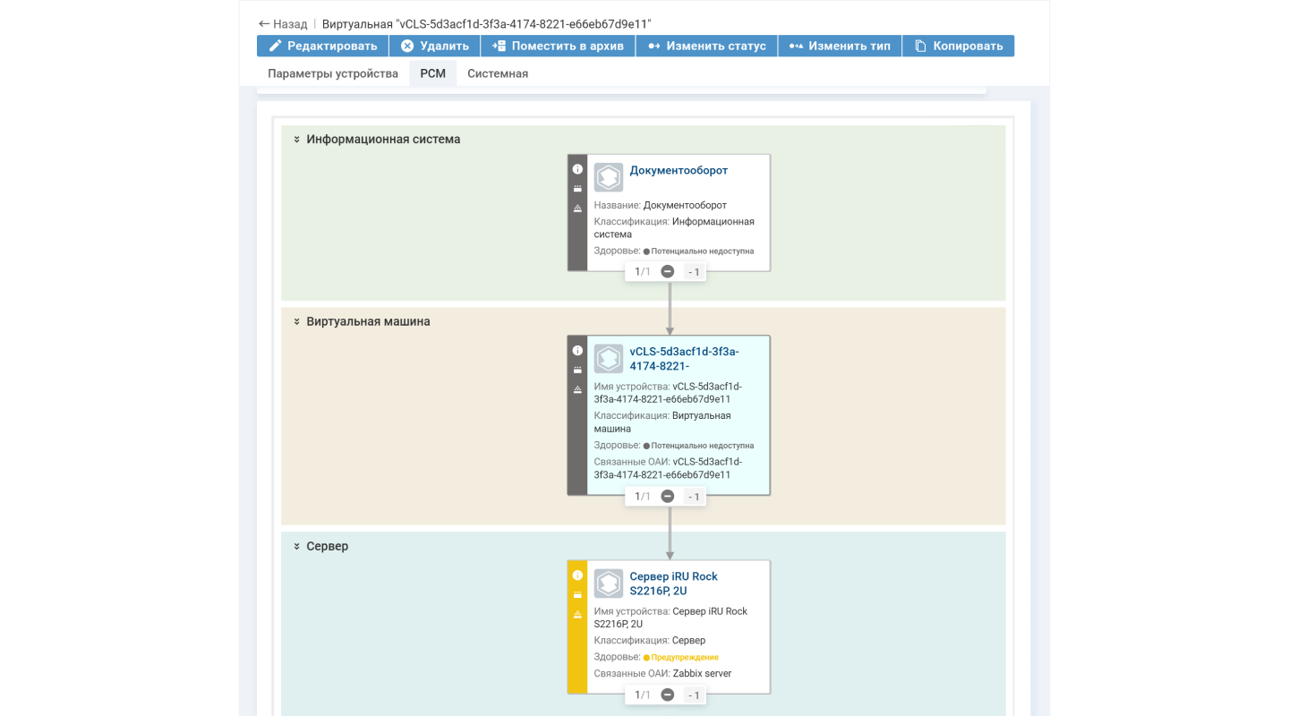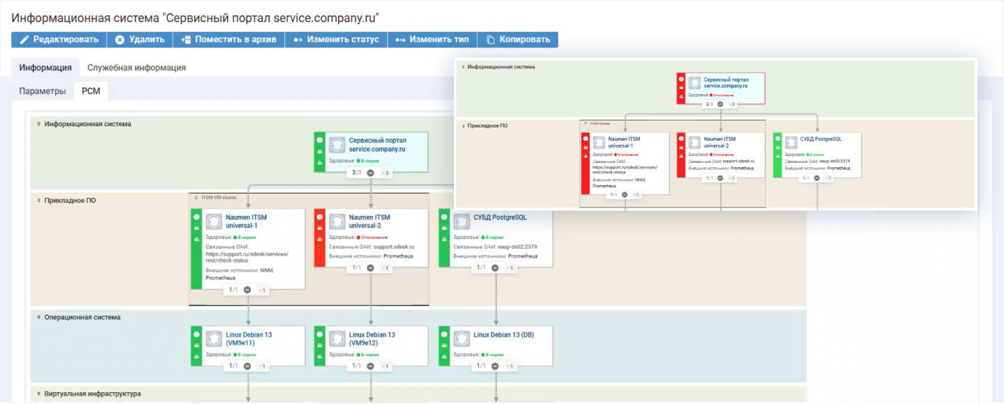 При обработке событий система учитывает связи между сервисами и оборудованием, что помогает понимать, как отказ данного компонента повлияет на разные сервисы. РСМ показывает прямое влияние каждого элемента, а также учитывает кластерные и резервные решения, чтобы корректно оценивать доступность сервисов даже при отказе части инфраструктуры.
