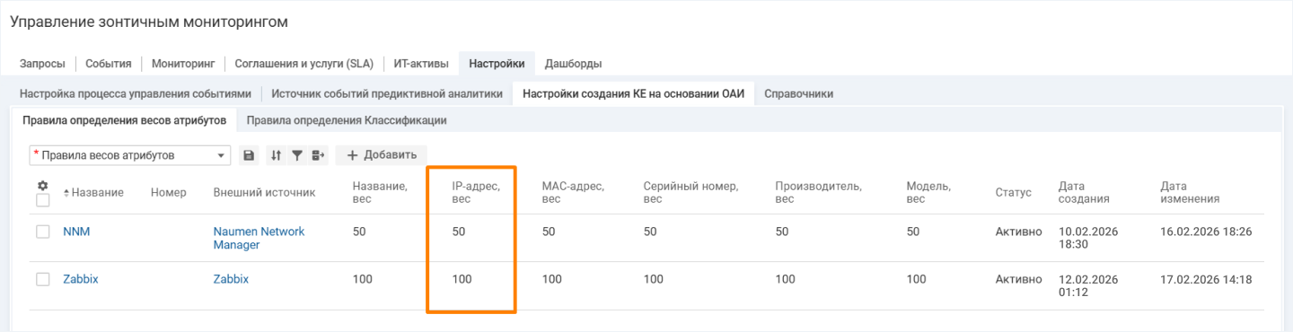 Приоритизация атрибутов задается в настройках создания КЕ по данным из подключенных систем