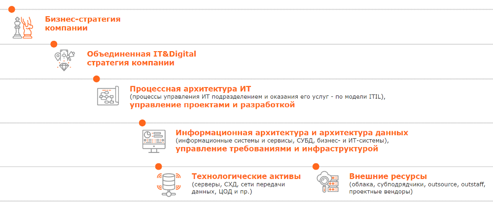 - Информационная архитектура и архитектура данных, процессы управления требованиями и инфраструктурой.