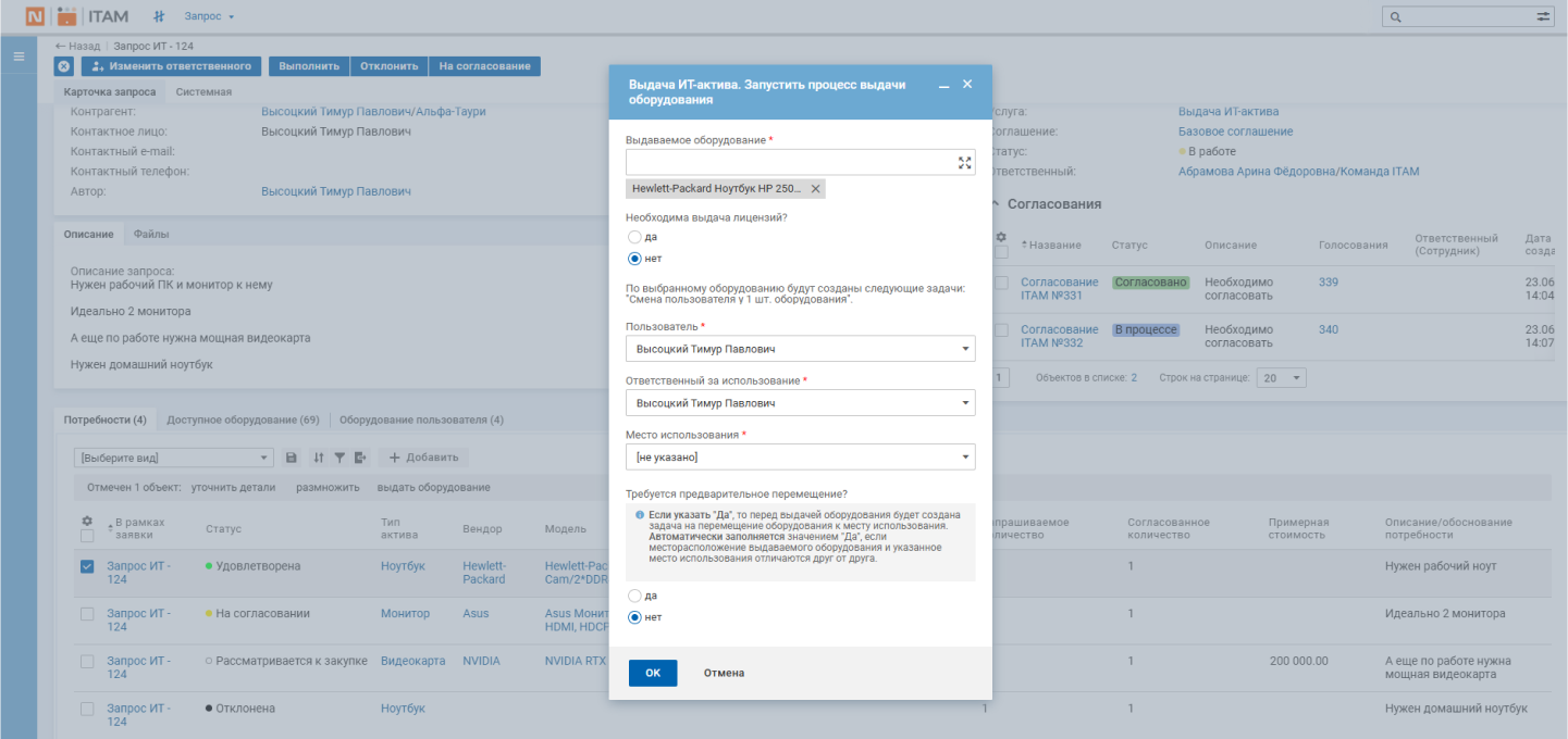 При выдаче техники и установке ПО система предоставляет необходимые данные по активам