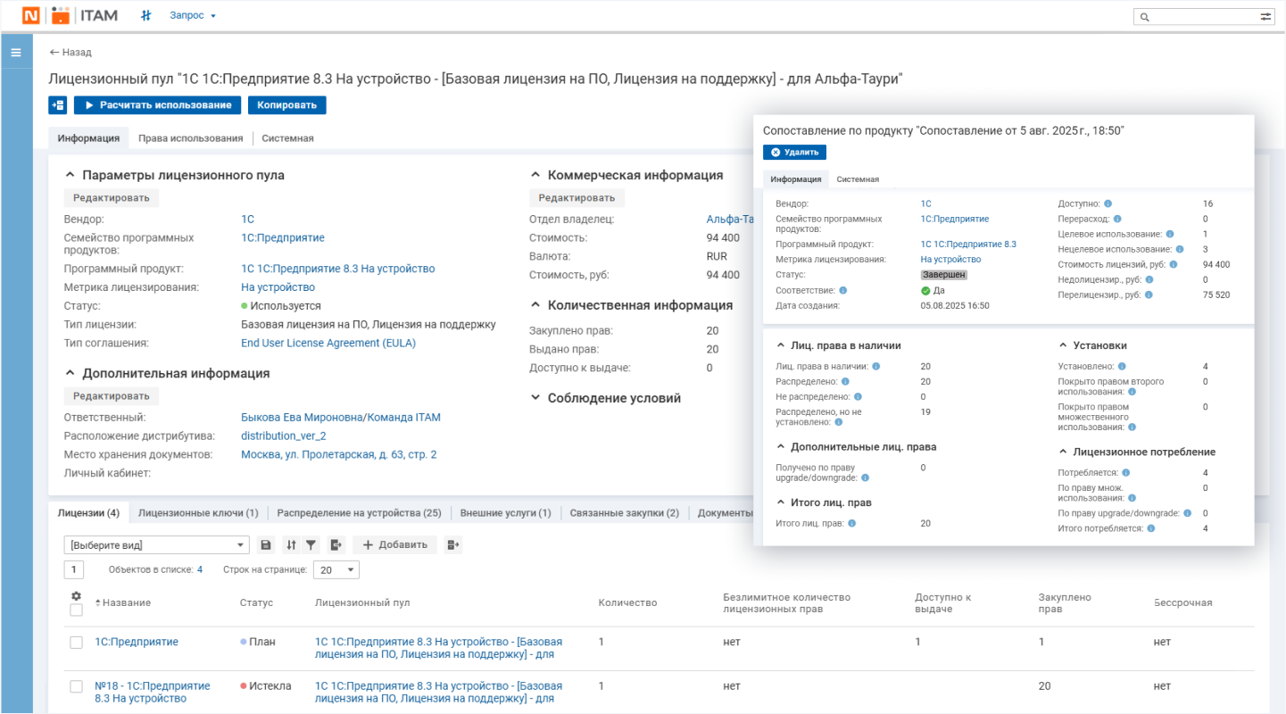 ITAM-система снимает подобные риски благодаря двум важным инструментам: учет лицензионных пулов и отчет по лицензионному соответствию. Данные из системы дискаверинга позволяют сравнить количество фактически используемых лицензий и закупленных, найти случаи нецелевого использования.