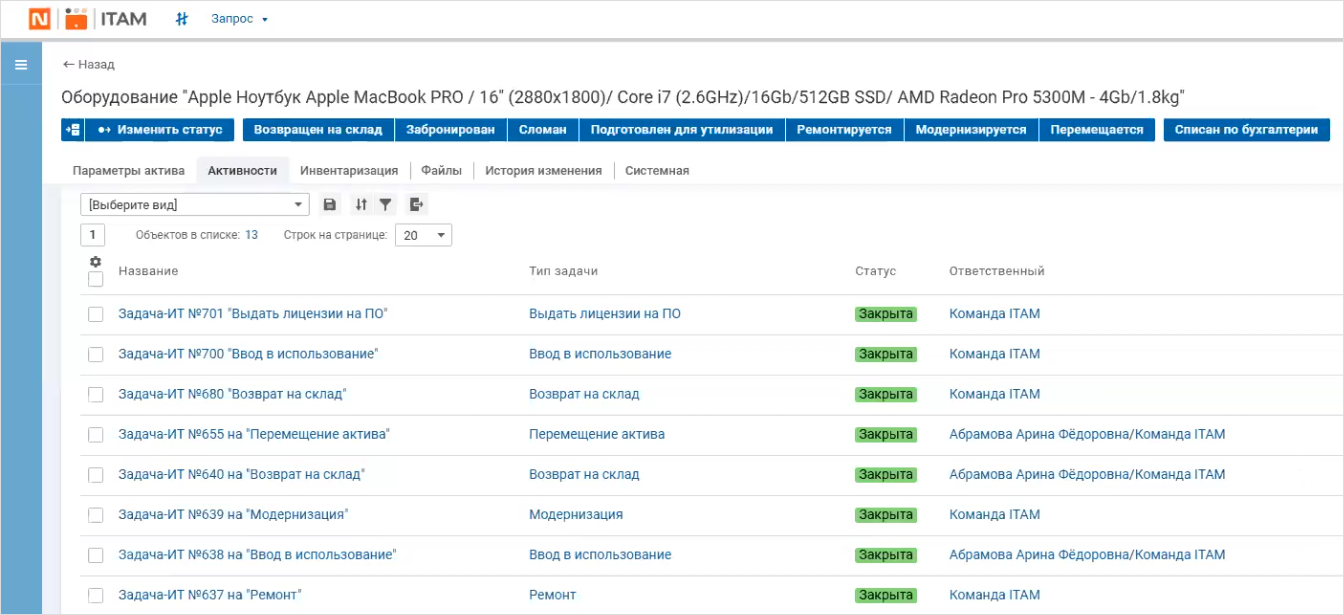 Система сохраняет полную историю действий, совершаемых с каждым ИТ-активом, поэтому оборудование не теряется