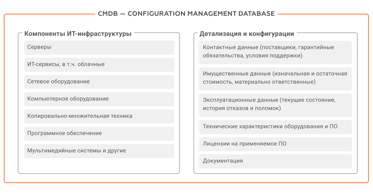 Чтобы решить эти задачи, создают CMDB — базу данных управления конфигурациями. Концепция CMDB позволяет рассматривать элементы