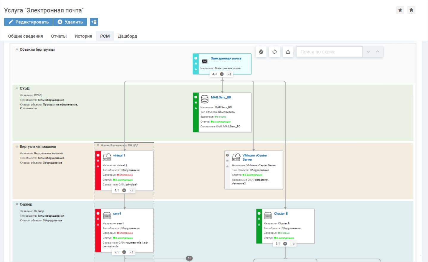 РСМ можно обогатить данными из систем мониторинга. Это позволит контролировать состояние инфраструктуры и услуг в режиме онлайн, а также определять причины сбоев. Например, построить РСМ можно в системе класса Service Desk, а отслеживать актуальное состояние КЕ и услуг — в системе зонтичного мониторинга.