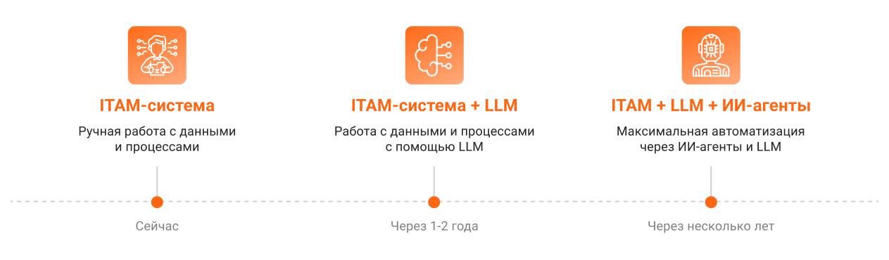 Это произойдет за счет изменения подхода к автоматизации процессов. Так, ITAM-система постепенно перестанет опираться на ручной ввод и анализ информации человеком. По мере роста эффективности больших языковых моделей (LLM) появятся новые возможности автоматизировать обработку данных, аналитические задачи и, формирование рекомендаций для последующих решений.
