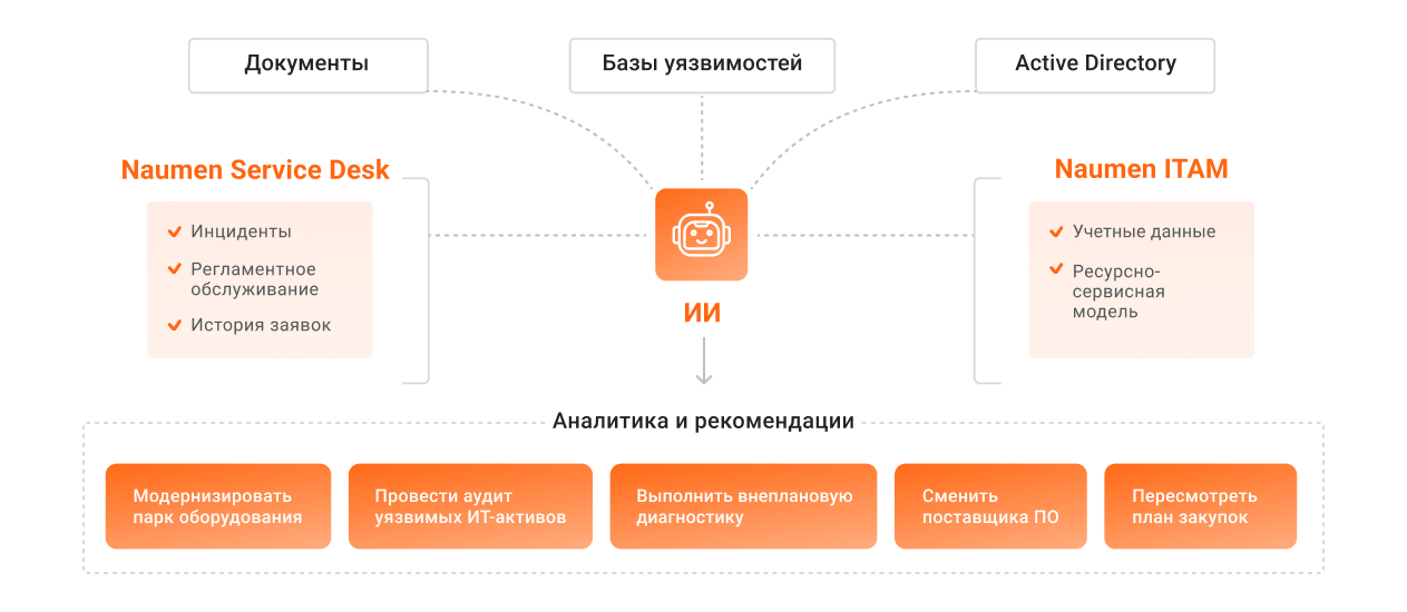 Поиск, анализ, актуализация данных об ИТ-активах. В крупной компании сведения об используемой технике и ПО бывают фрагментированы, противоречивы, быстро устаревают. Специально обученный ИИ-помощник сможет сканировать и анализировать все источники: результаты инвентаризации, информацию из Active Directory, заявки в Service Desk, документы по закупкам.
