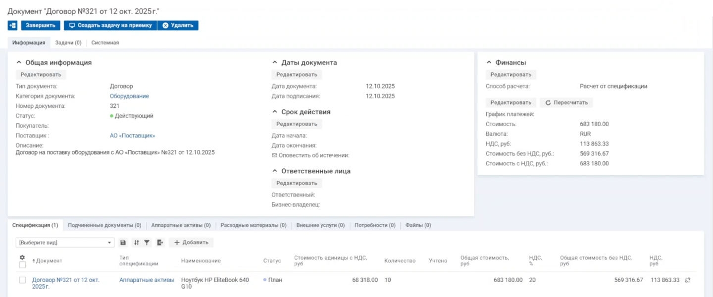 - Создает в Naumen ITAM две новые карточки: договора и спецификации.