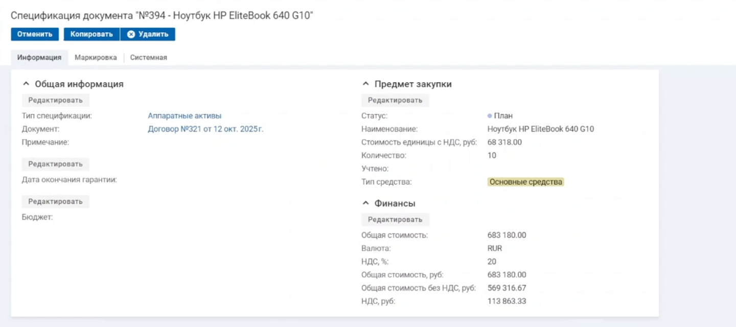 - Агрегирует и структурирует все имеющиеся данные о новом оборудовании: классификация и модель, номер спецификации, месторасположение, МОЛ.
