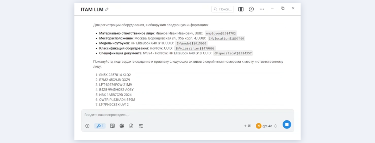 ИИ объединяет всю доступную информацию о каждом ИТ-активе. Например, спецификацию и технические данные из договора, серийные номера, МОЛ, месторасположение
