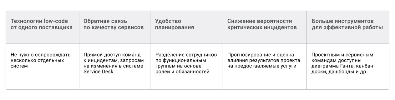 - Гибкость при управлении изменениями и внедрении новых сервисов за счет объединения процессов в рамках единой системы.