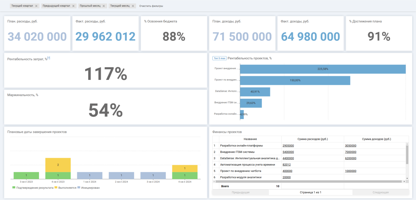 Дашборд позволяет руководителю портфеля проектов контролировать достижение финансовых целей и прогресс проектов, входящих в портфель.