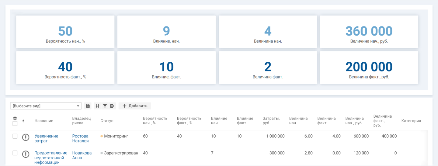 Дашборд позволяет руководителю проекта и другим сотрудникам контролировать прогнозируемые негативные события. А также оценивать эффективность мероприятий, направленных на снижение величины возможных отклонений от плана.