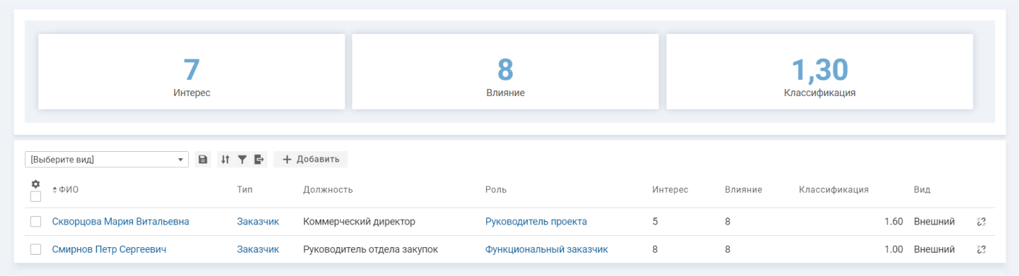 В начале проекта создается реестр стейкхолдеров и оценивается уровень влияния и интереса каждого. На этой основе рассчитывается показатель классификации. Сводные данные отображаются на дашборде, на этом же экране выводится общий список заинтересованных лиц с индивидуальными оценками.