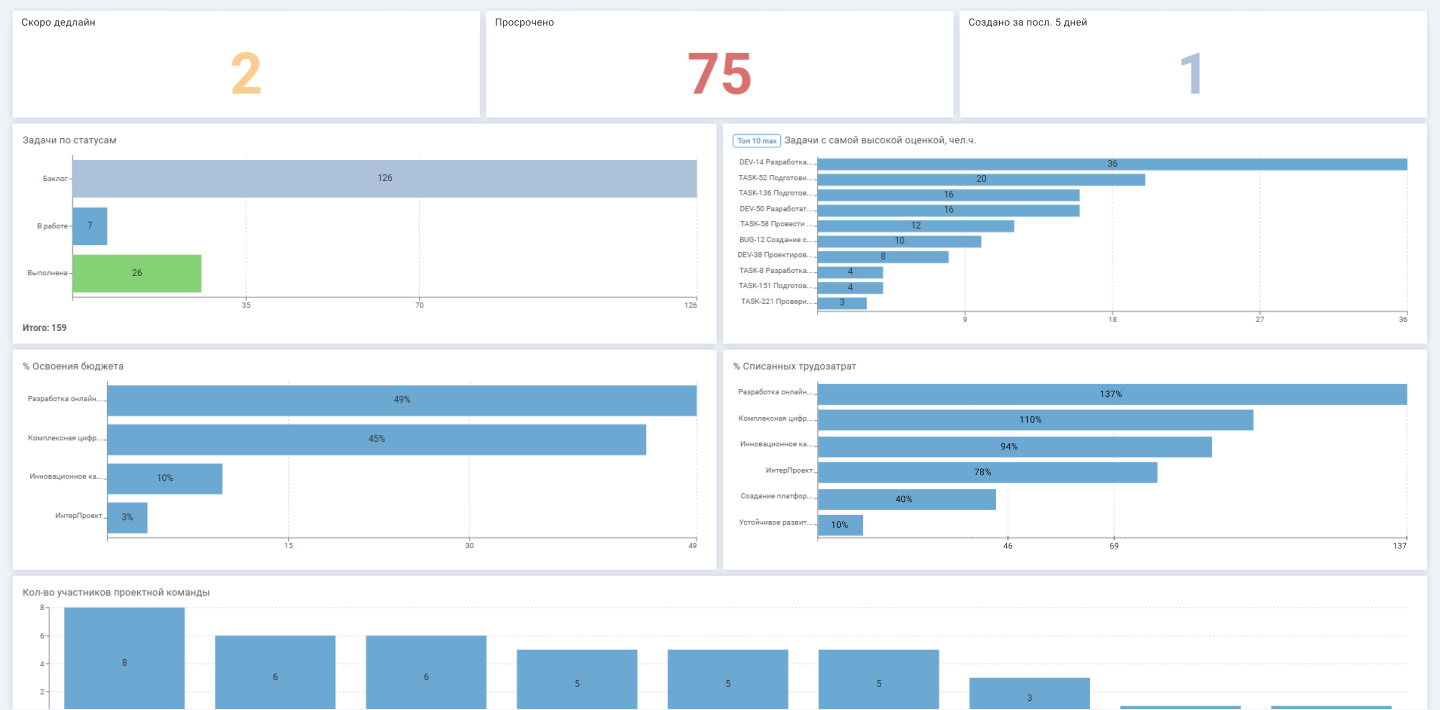 В целом дашборд можно использовать для оперативной оценки ситуации. Также руководитель может поделиться ссылкой на аналитику с заинтересованными лицами, например, с функциональным руководителем или руководителем портфеля проектов.