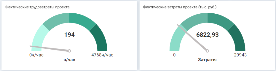 Первый спидометр показывает соотношение плановых и фактических трудозатрат, второй — соотношение плановой стоимости проекта к фактической