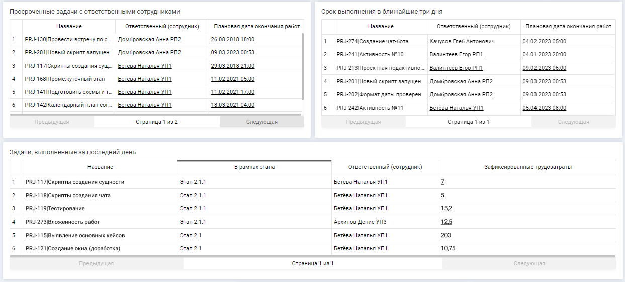 В таблицах выводится детализация по задачам для аналитики, как соблюдаются запланированные сроки