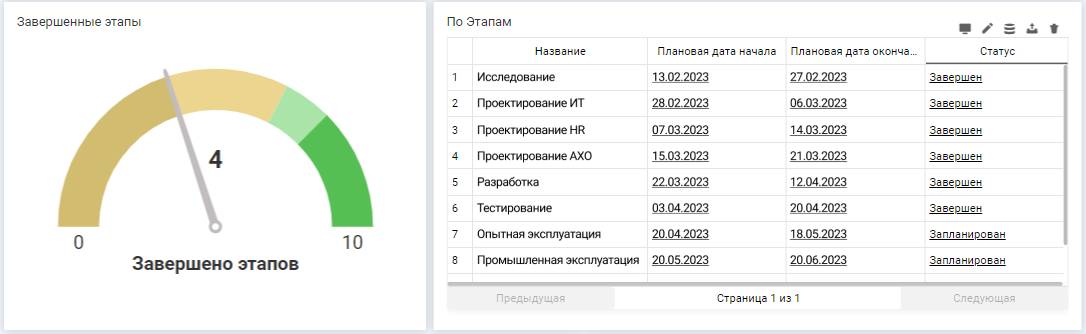 Завершенные этапы позволяют видеть выполненные крупные блоки работ. Например, на проекте внедрения ПО: исследование, подготовка технического задания, настройка системы, обучение пользователей, опытная эксплуатация.