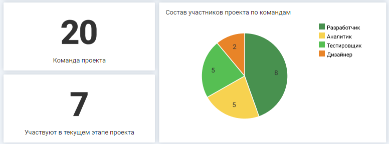 Команда — это ключевой ресурс, поэтому на дашборд можно добавить информацию, сколько всего сотрудников участвует в проекте и к какому направлению они относятся.