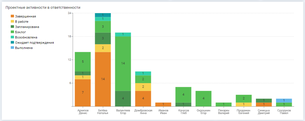 Загрузка по проекту позволяет получить дифференциацию по участию команды в определенных активностях, а также количеству задач в ответственности каждого сотрудника.