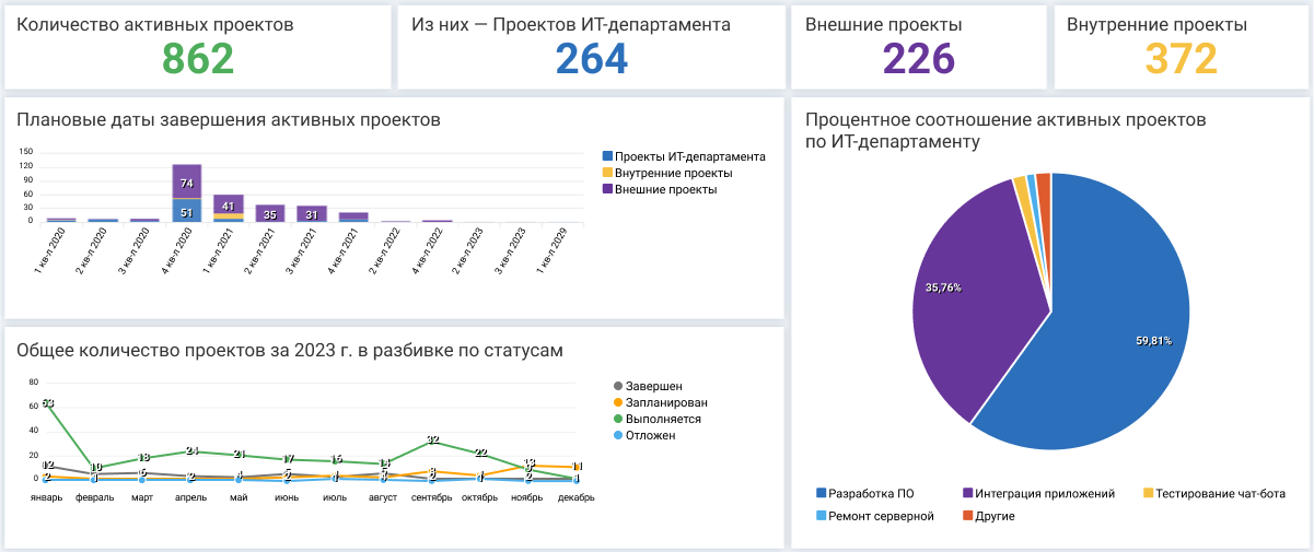 Руководителю проектного офиса важно контролировать прогресс нескольких проектов. Для этого можно использовать общую сводку, которая содержит сведения о количестве активных проектов и плановых сроках завершения. Состав проектного портфеля компании будет удобнее отслеживать, если вынести количество внутренних и внешних проектов.