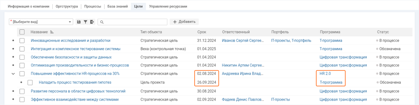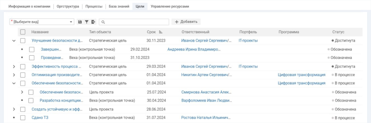 - отображает всю цепочку реализации цели: портфель или программу, которые на нее работают, и проекты в их составе;