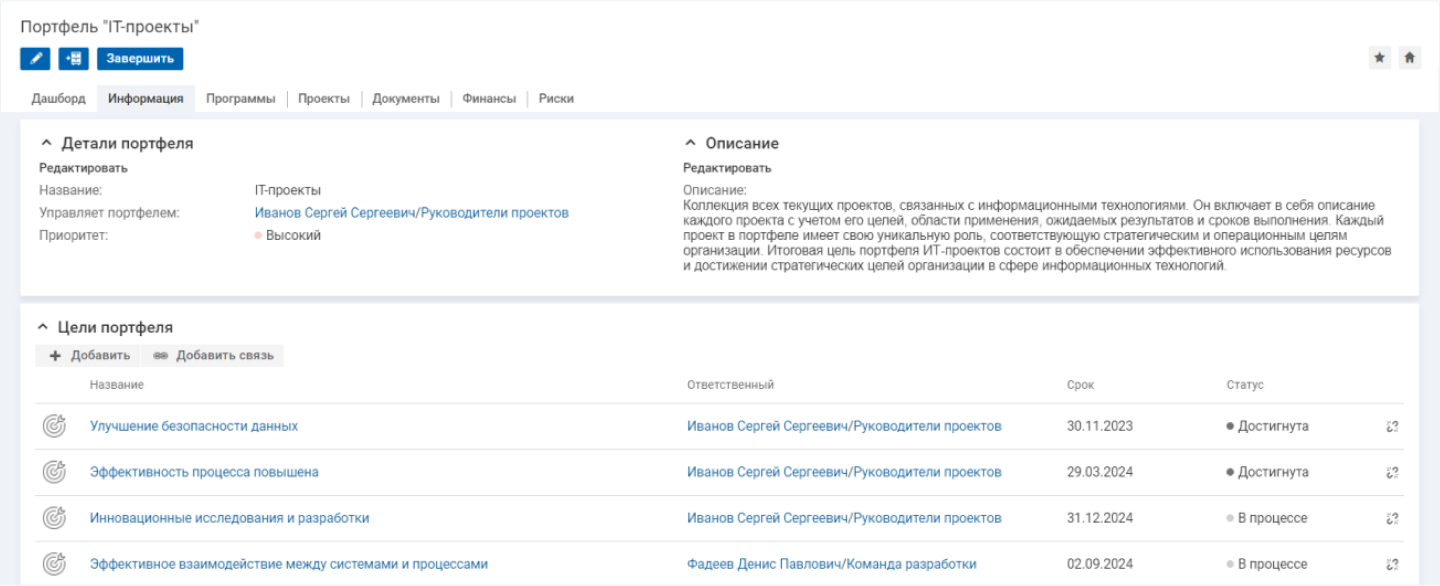 Ключевые сведения как по портфелю или программе в целом, так и по проектам, которые в них входят, доступны в любой момент