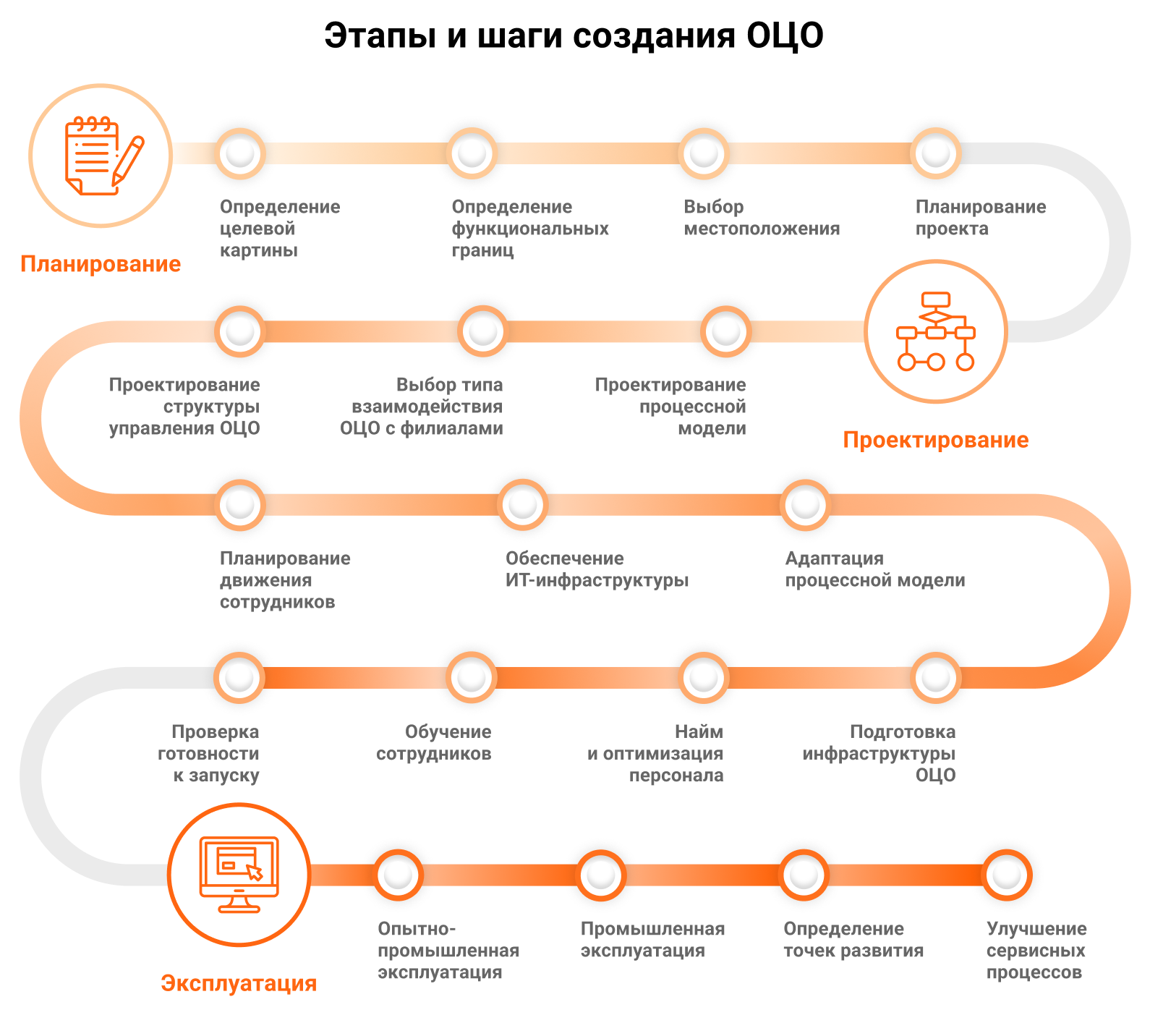О практике создания ОЦО сказано уже довольно много. Когда бизнесу полезно внедрение ОЦО, какие функции переводить в первую очередь, какие ИТ-инструменты должны войти в технологическую платформу новой сервисной структуры — есть разные подходы к решению этих вопросов. Общий путь компании к запуску такого центра можно представить следующим образом.