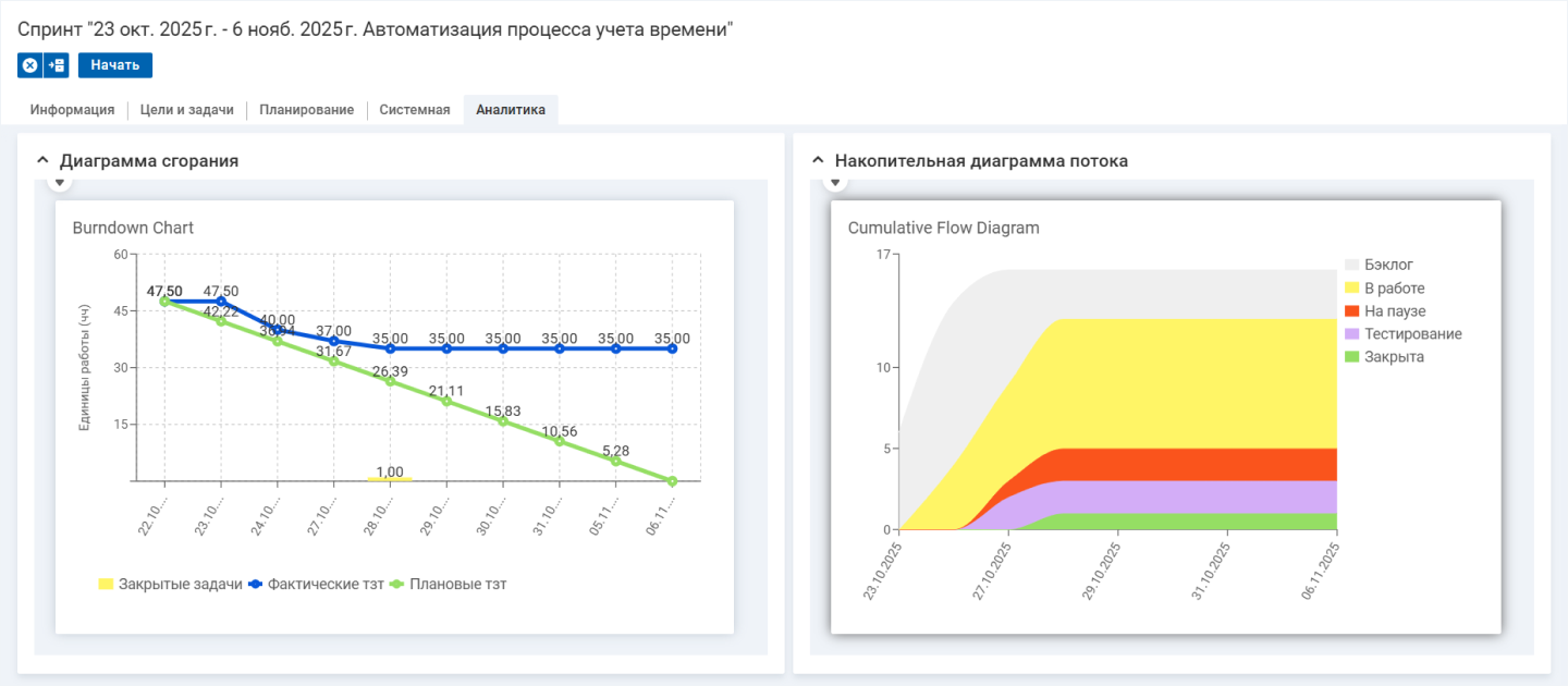 С помощью Burndown Chart получится отслеживать скорость «сжигания» задач командой, а с Cumulative Flow Diagram — распределение задач по статусам на протяжении всего спринта