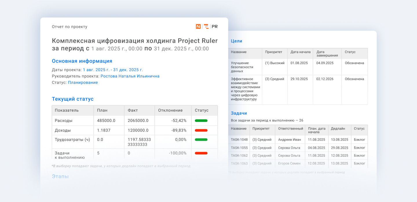 Отдельный вариант отчетности подтягивает актуальную информацию из проекта по заданным параметрам. Это могут быть статусы задач, риски, расклад по этапам: плановый и фактический и другое. Все сформированные отчеты хранятся в NPR. В любой момент их можно открыть или скачать. Это удобный инструмент для контроля, а также для обсуждения на регулярных встречах с командой, руководством или стейкхолдерами.