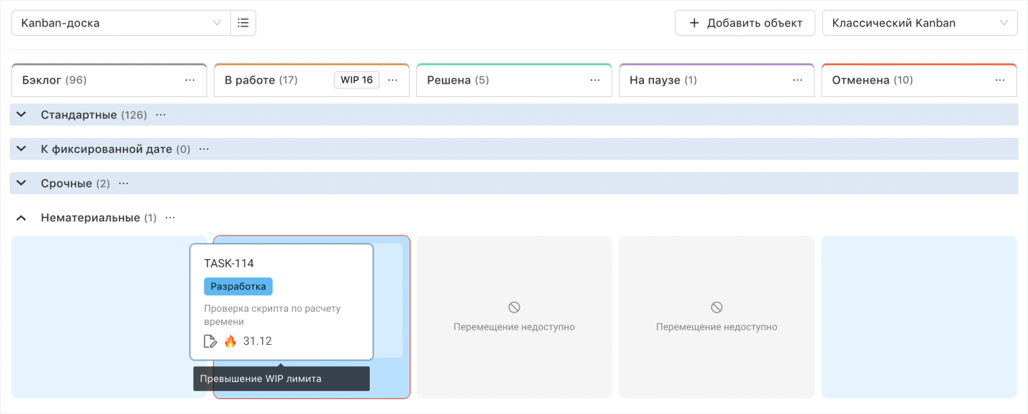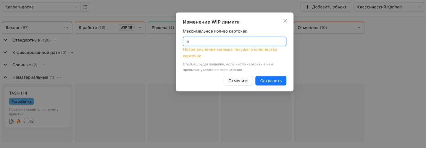 Ограничение числа задач, которые одновременно могут быть в работе у команды, — еще одна традиционная возможность Kanban. Эта опция позволяет избегать перегрузки участников и обеспечить непрерывность потока задач.