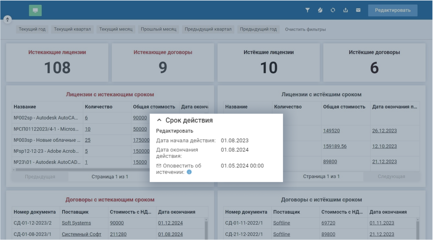 Дашборд в Naumen SAM аккумулирует информацию по срокам лицензий и договоров