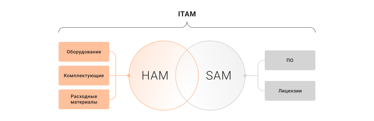 HAM и SAM отвечают за различные типы ИТ-активов, управление которыми объединяется в ITAM