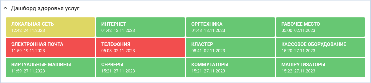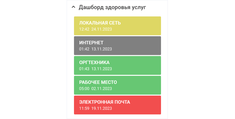 Что выводится на дашборд — услуга, цветовой индикатор состояния, дата и время изменения состояния. Из любой услуги можно перейти на
