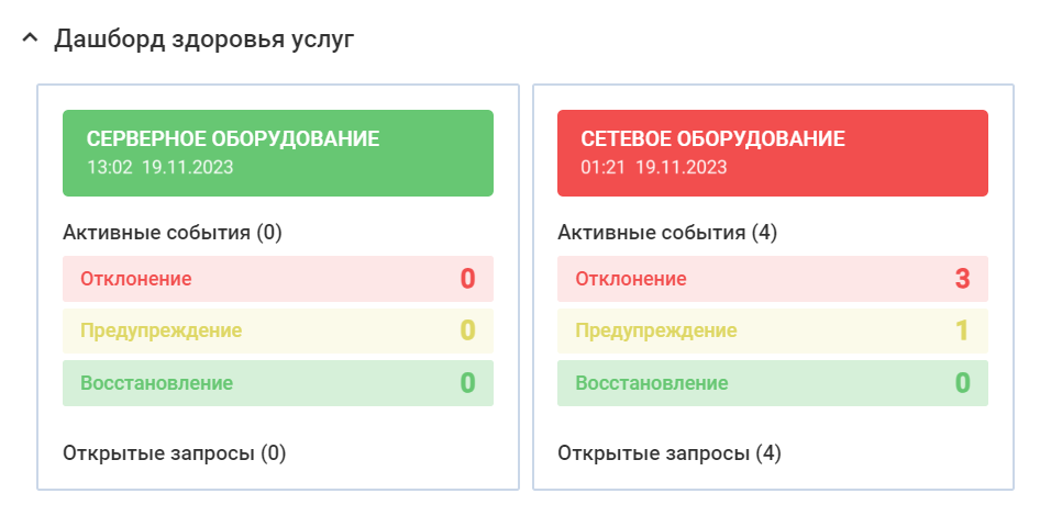 Что выводится на дашборд — название и состояние поддерживающей услуги, дата обновления состояния, активные события. Например, отклонение, предупреждение, восстановление.
