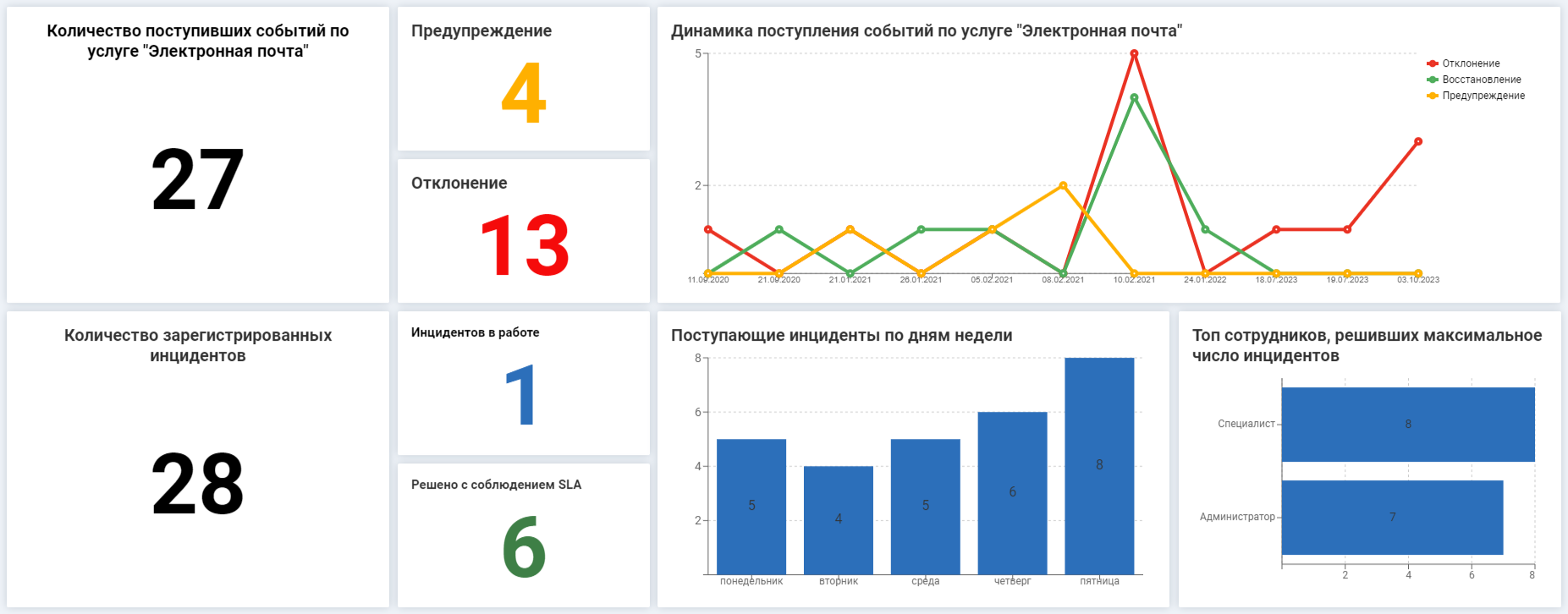 - Решено, Просрочено — статистика по инцидентам позволяет оценить эффективность работы специалистов.