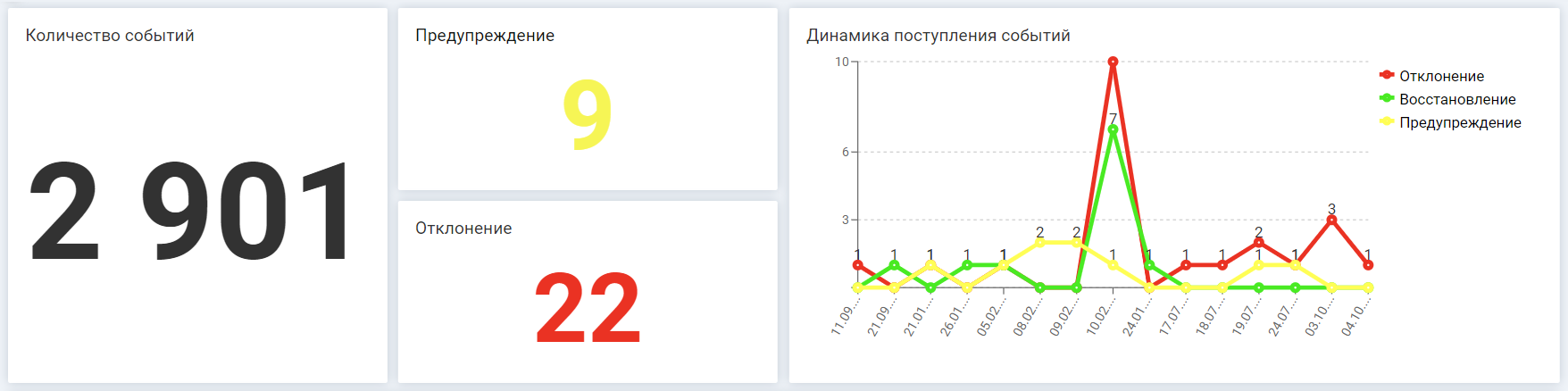 - Динамика поступления событий по типам и датам — показываются не только «плохие» события (отклонения и предупреждения), но и «хорошие» — восстановление работоспособности.