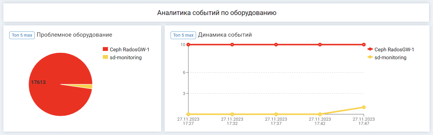 - Топ-5 проблемного оборудования — рейтинг формируется по количеству негативных событий на оборудовании.