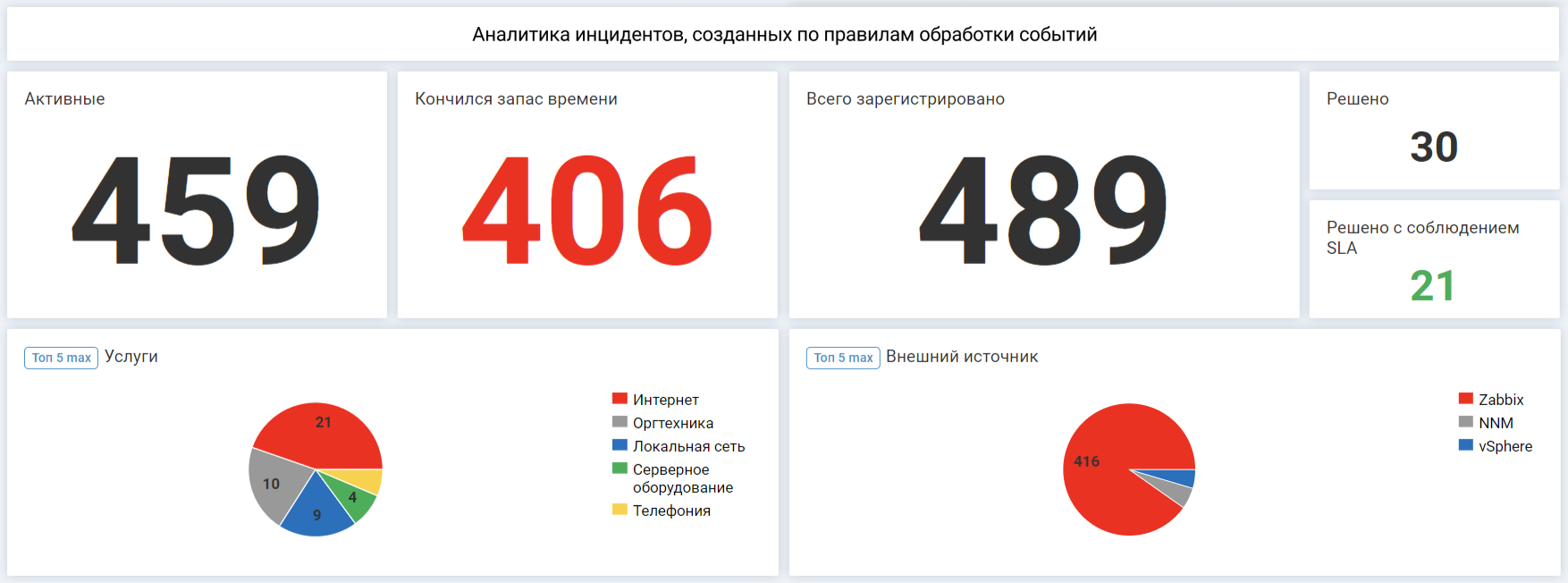 - Топ-5 проблемных услуг — рейтинг формируется по числу инцидентов, созданных на основе событий, которые приходятся на каждую услугу за период.