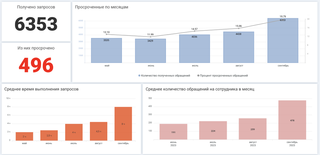 Подобный дашборд нацелен на анализ эффективности работы, чтобы в опоре на данные оценить, нужно ли пересмотреть SLA, расширить штат, и как быстро сотрудники решают инциденты в принципе.