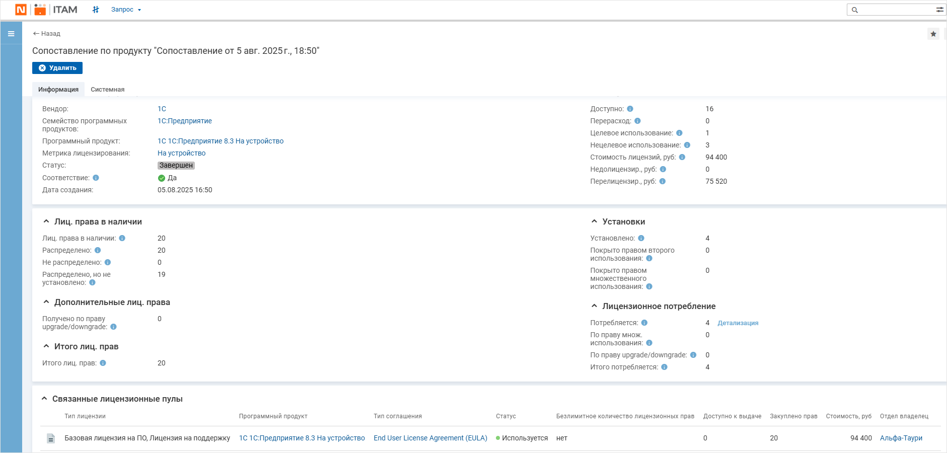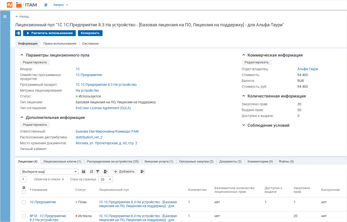 Контроль над программными активами осуществляется через лицензионные пулы. Это позволяет распределять лицензии на один продукт между разными отделами предприятия. В карточке лицензионного пула отображаются все необходимые данные: программный продукт, тип лицензии, стоимость, ответственный, количество прав (сколько закуплено, сколько используется и остаток).