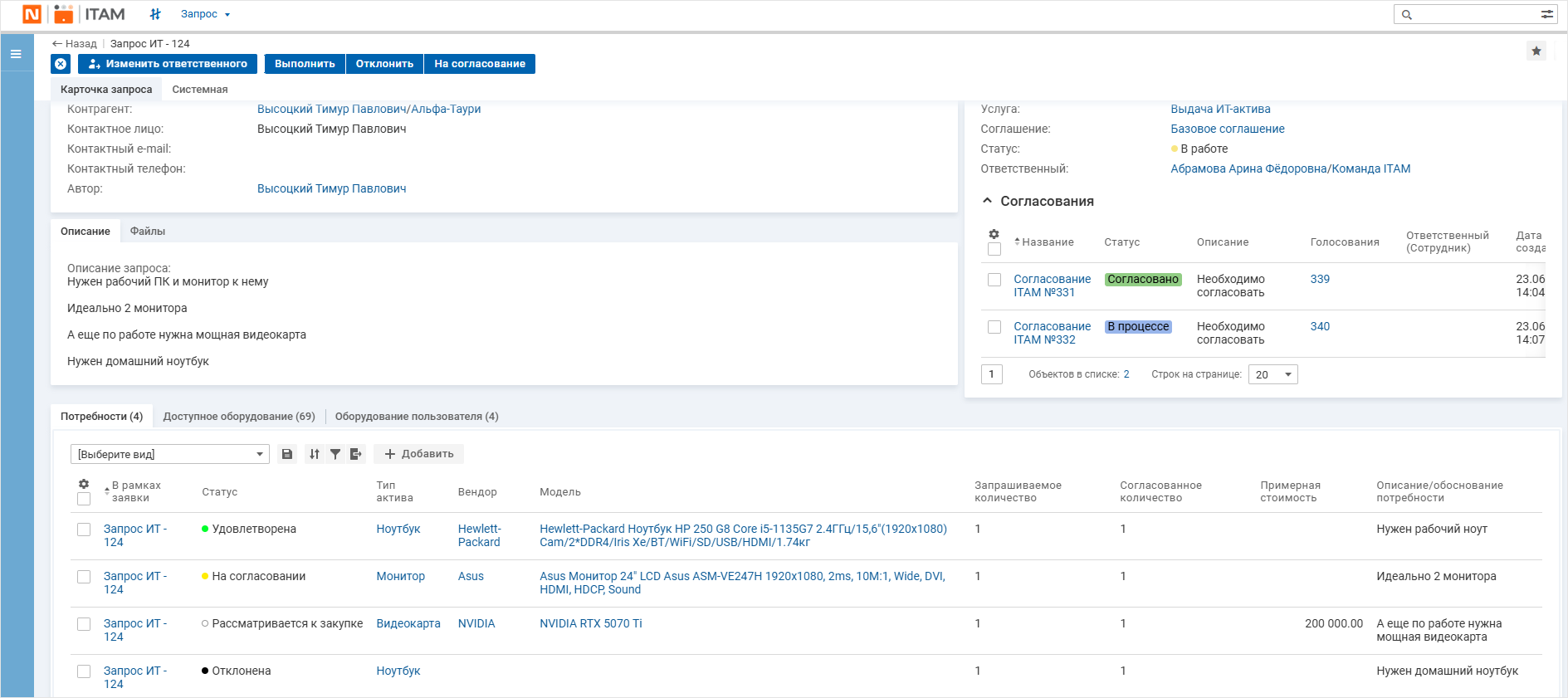 Различные статусы указывают, какая работа осуществляется по каждой потребности, зарегистрированной пользователем. Например, «Рассматривается к закупке» означает, что на складе сейчас нет требуемой видеокарты, но компания может ее приобрести. «На согласовании» — такую потребность сначала должен одобрить руководитель.