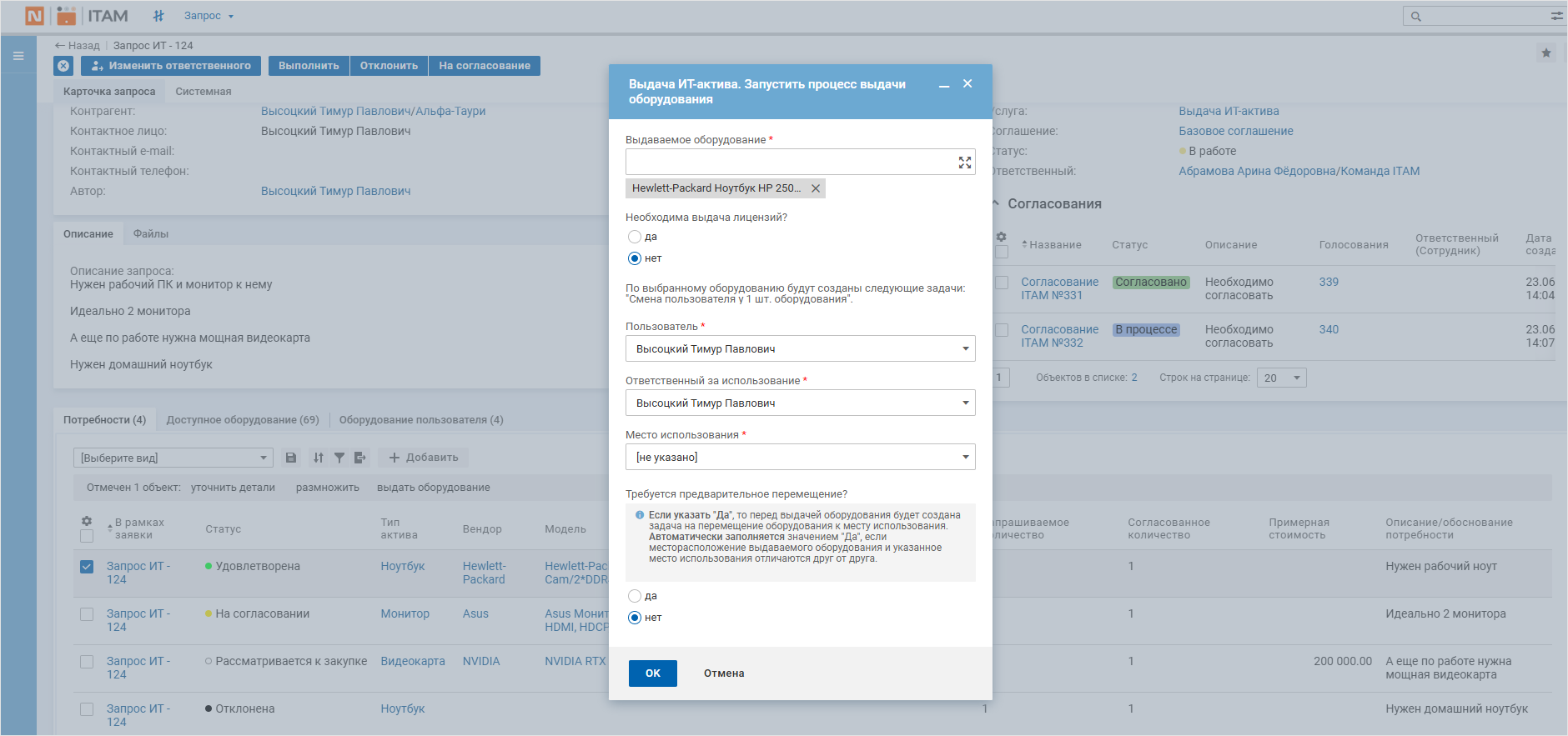 Если потребность получила статус «Согласована», то ноутбук выдается новому дизайнеру. Специалист запускает этот процесс в системе, заполняя соответствующую карточку. В ней уже указано, кто и какое получит оборудование. Остается выбрать, нужна ли лицензия на ПО и по какому адресу работает сотрудник. Система также автоматически определяет, есть ли необходимость в перемещении